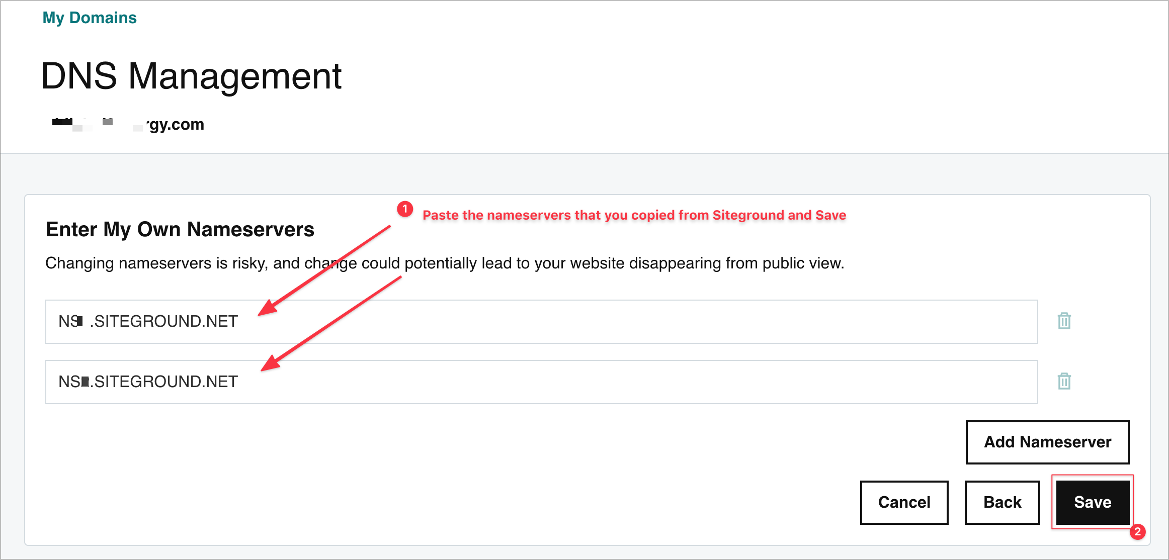 In the next screen, you will get a new host server DNS record, which you need to add to your Godaddy domain. This is a must to connect a GoDaddy domain to Siteground. Copy the DNS records in your notepad, which we will use later in the Godaddy portal.